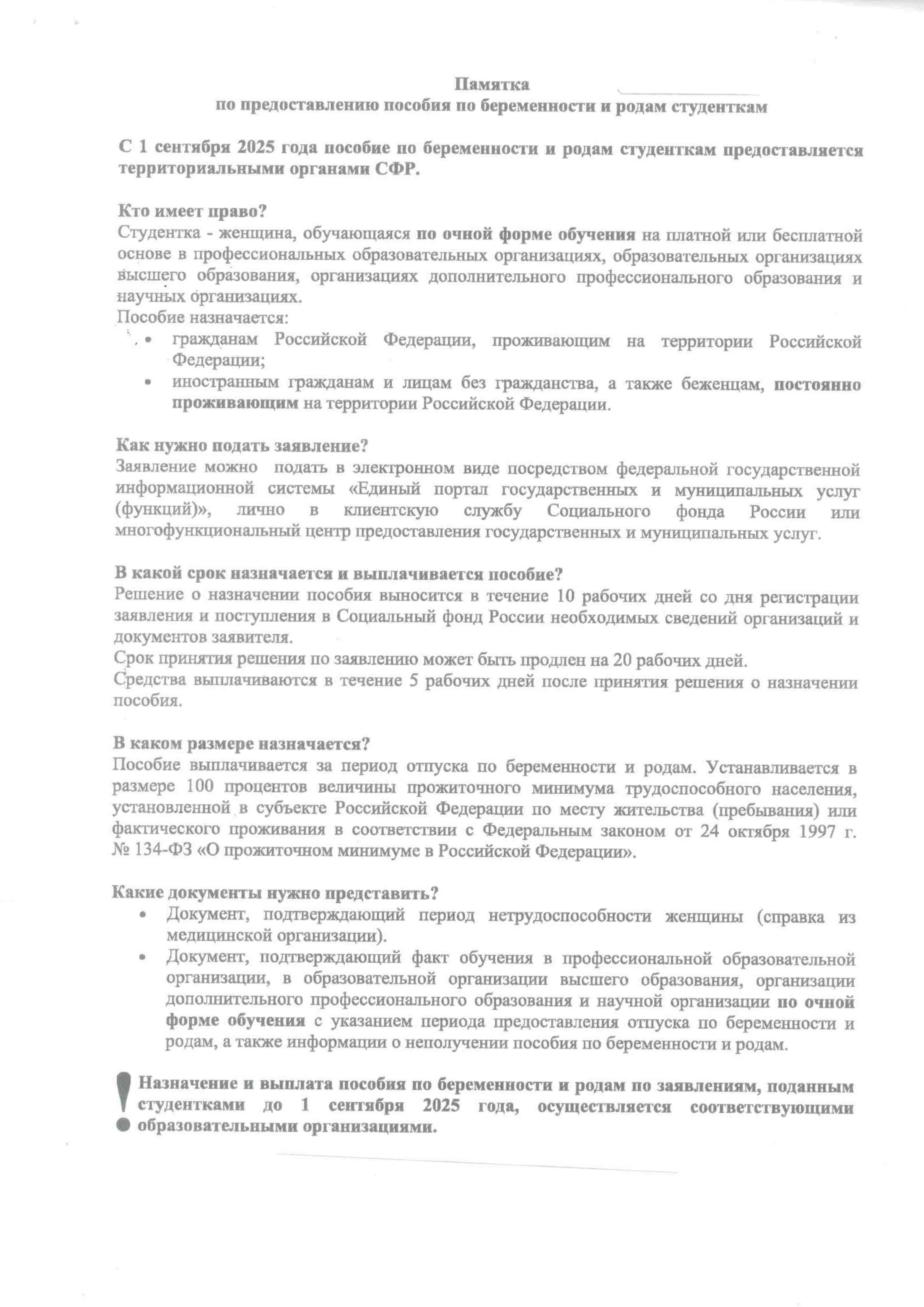 Назначение и выплата пособия по беременности и родам по заявлениям, поданным студентками до 1 сентября 2025 года, осуществляется соответствующими образовательными организациями.